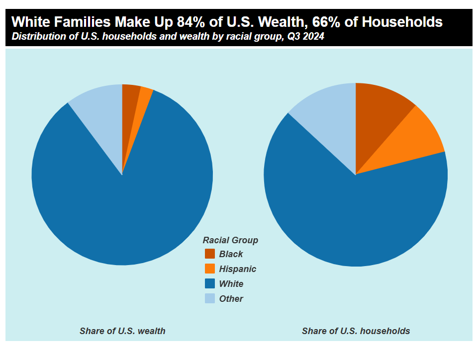 • White households hold 84.2% of all U.S. wealth while making up only 66% of households. This means white families hold about 15 times more wealth than Black and Latino families combined.