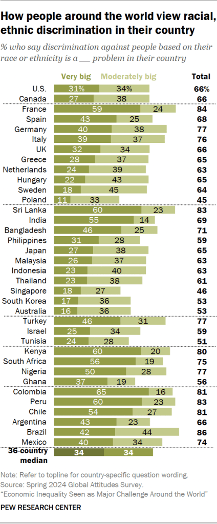 • Globally, more than half of people in many Latin American countries (Chile, Colombia, Mexico, Peru) believe racial or ethnic discrimination is a great deal contributing to economic inequality. Pew Research Center