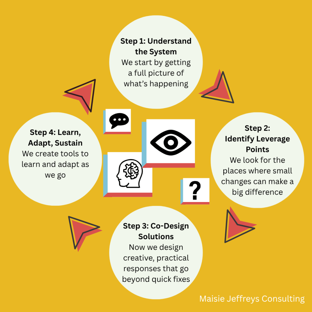 I guide organisations and cross-sector teams through a step-by-step journey to uncover root causes, make sense of complexity, and design practical solutions using systems thinking. This approach is grounded, collaborative, and works across many different sectors and types of challenges.